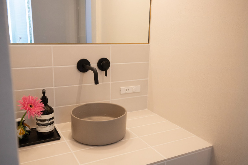 タイル、手洗い器、壁を、グレーとベージュのグラデーションでコーディネート。ブラックの水栓が、引き締め役として効いています。