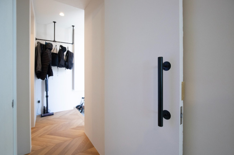 フラットなデザインのリビングドア。玄関側はアイアンのドアハンドル、リビング側はシンプルな手掛けにして、閉じた時の存在感を控えめにしています。