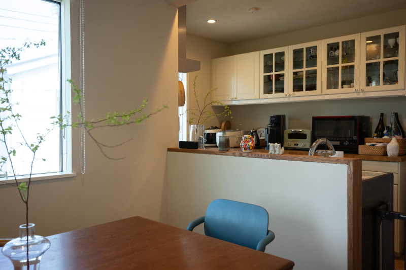 既存クロスの上から珪藻土を塗った壁が、光をやわらかく反射。キッチンの手元を隠す腰壁は、オーク材を笠木として貼って、ダイニングの家具と馴染む設えに。