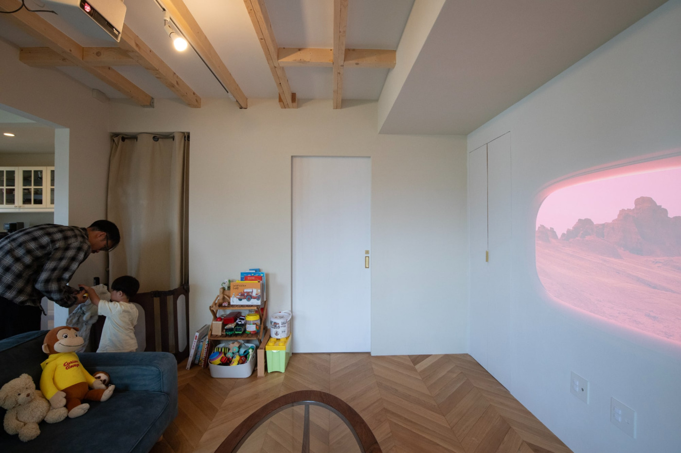 建具枠のないデザインの引き戸と収納扉で、壁面をすっきりと演出。