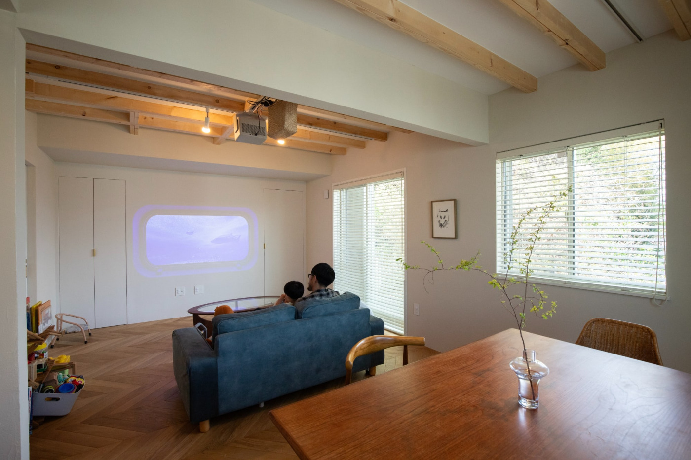 既存のクロスの上から珪藻土を塗った壁は、陰影がやわらか。プロジェクターを映す部分の壁は、映像の色映えに考慮して、珪藻土の色を変えています。