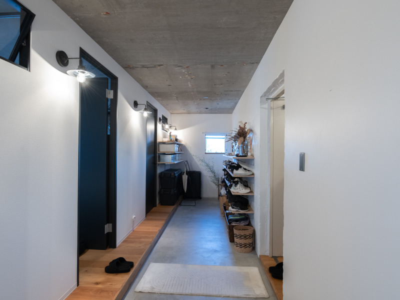 玄関から伸びるモルタルの土間。靴などの収納だけでなく、右と左で空間を仕切る役割もあります。