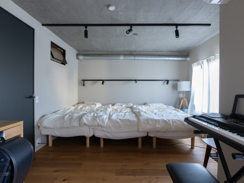 明るい光が取り込める開放感のある寝室。室内窓を設けてとなりの空間とのつながりをもたせました。
