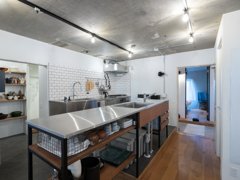 大きな作業台やシンクを備えたステンレス天板のⅡ型キッチンは、観葉植物の世話や配膳にも活躍。ステンレスの『フラットレンジフード』を採用し統一感のある空間に。