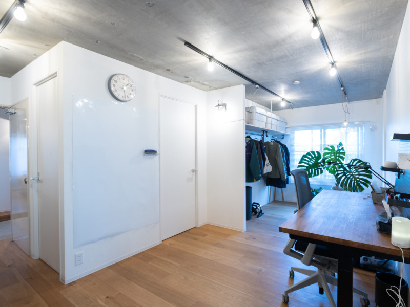 書斎として使っているフリースペースの奥にはオープンなクローゼットを備えることで、書斎に限らず様々な用途で活用できる場所にしています。