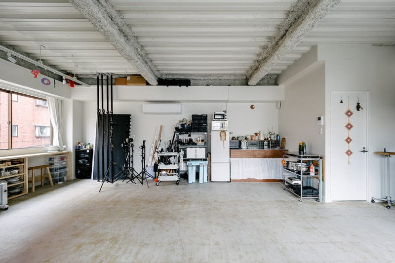 フォトスタジオとして使われているオフィススペース。あらわし天井を生かしたシンプルな内装に木やタイルを使ったキッチンがアクセントになっています。