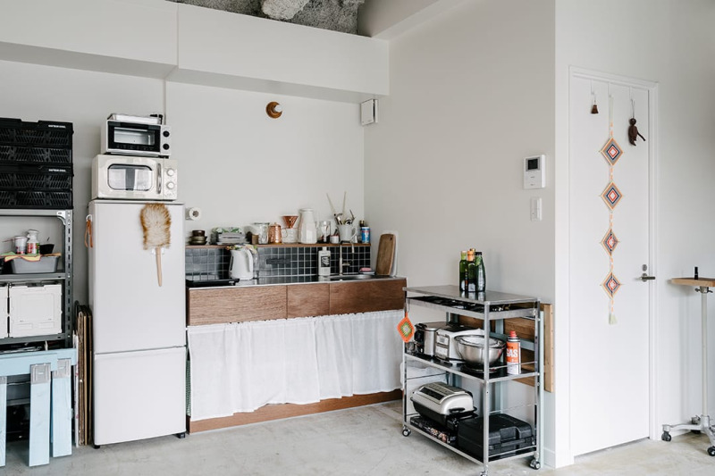 白い壁に濃色のタイルとラワンの『木製ミニマルキッチン』が温かみを添え、ほっとする空間に。