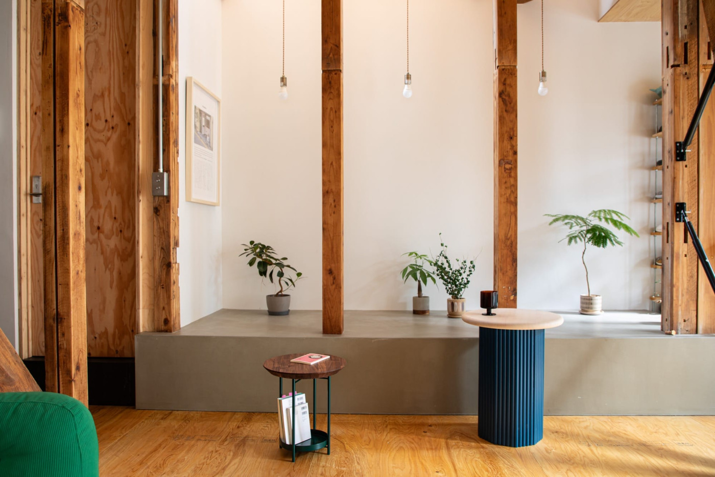土間の小上がりにサイドテーブルを添えて。小さなテーブルは移動もしやすく、その場の過ごし方を広げてくれる。