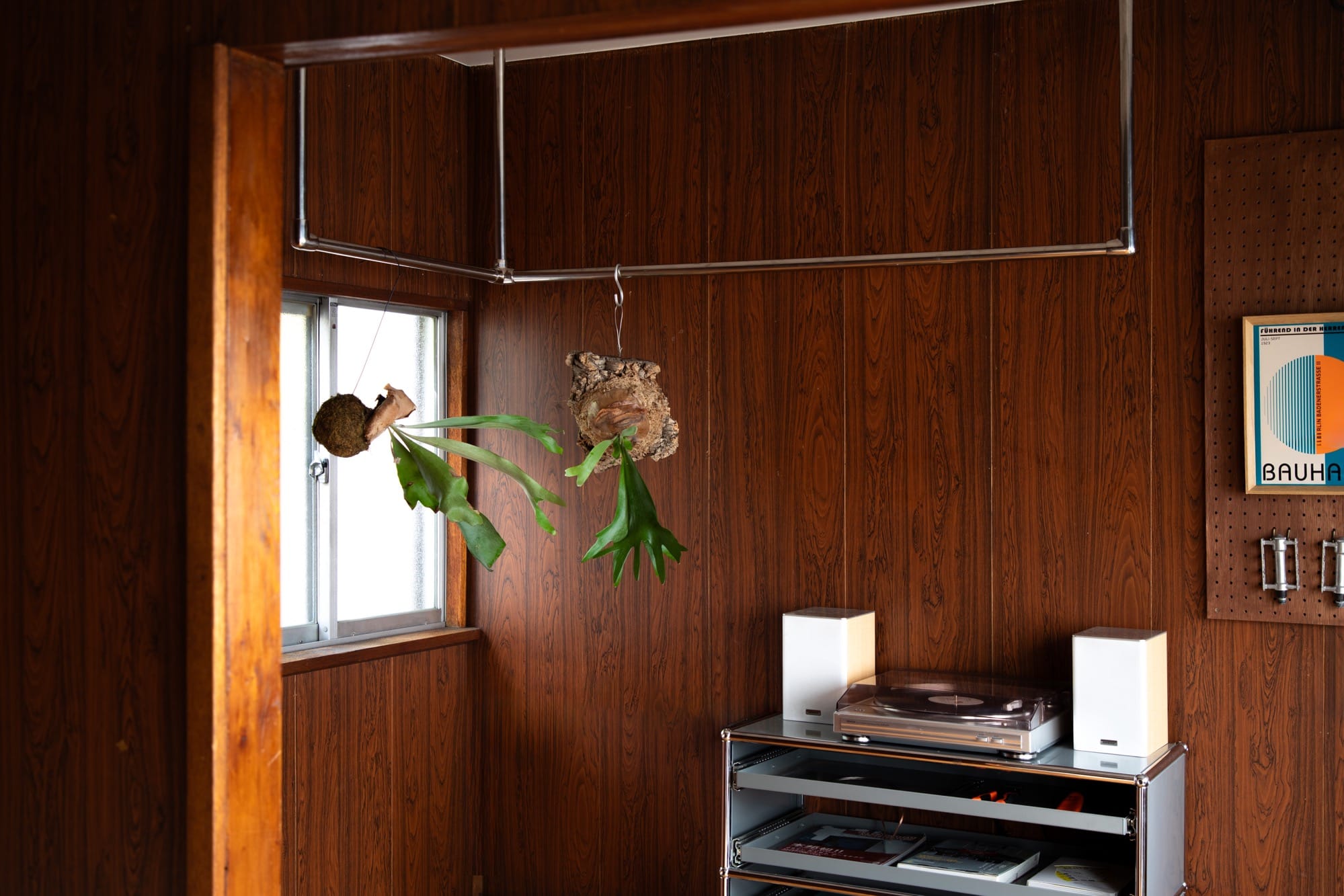 植物の特等席として贅沢に空中を使ってみる。築古戸建にキラリと光るラインが入ることで、キリリと空間が引き締まる。
