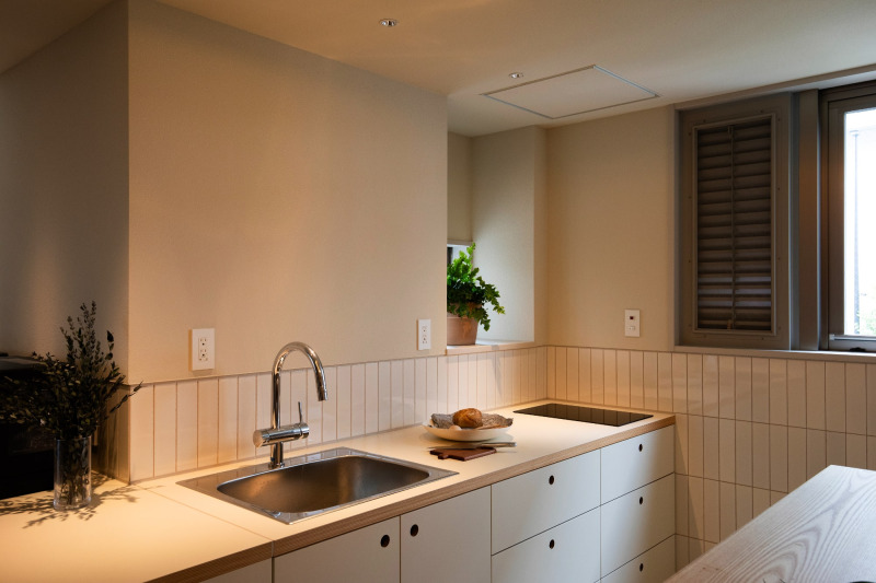 質感のある壁とレンジフードのないフラットな天井が、落ち着いた居心地をつくっているキッチン。点検口のように見える四角いスリットが、換気扇になっています。