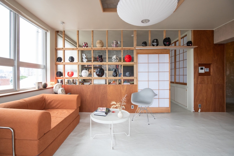壁の仕上げ材を剥がし、既存の間柱に棚板を渡した棚は、アート作品のサイズとぴったり。棚の奥はアーティストのアトリエスペース。