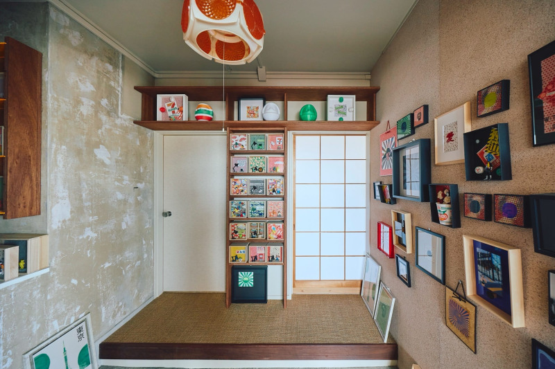 ショールームとして使うため、至る所に作品を飾りたいという要望を受け、建具を囲むように棚を造作。