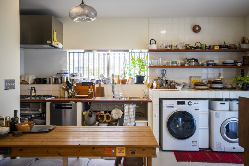 洗濯機、ガス乾燥機も水仕事を一箇所にまとめたキッチン。木とタイルの天板をつなげて。