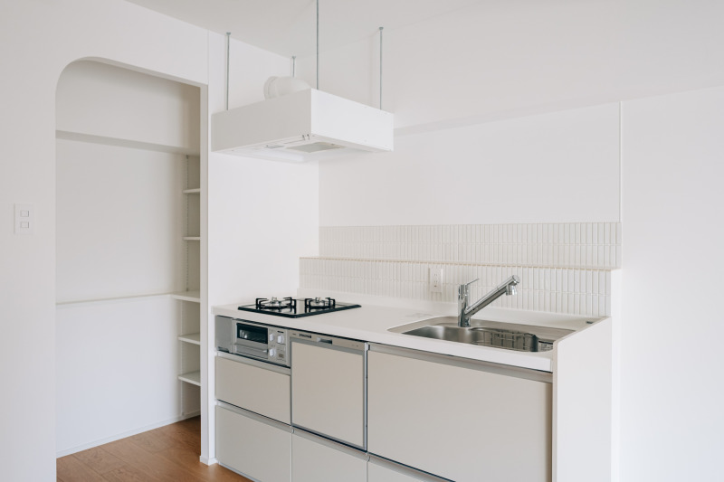 リビングにはコンパクトな食洗機付きのシステムキッチンを配置。壁の白に合わせて、キッチン本体やレンジフード、タイルも白で統一し、空間をすっきりと。