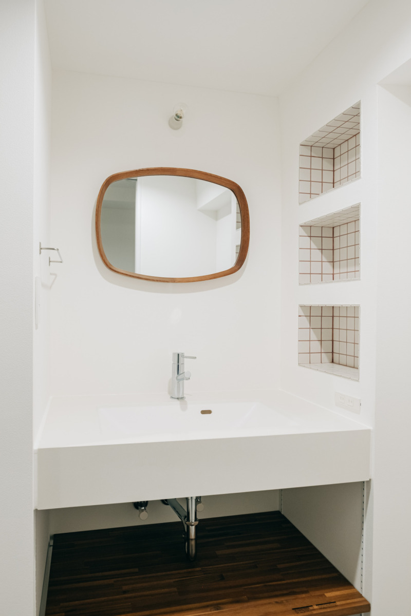 洗面にはスクエアのフォルムが存在感を放つ『木製ラウンドミラー』を設置。カラー目地を使ったニッチまわりのタイルも、可愛らしいポイントになっています。