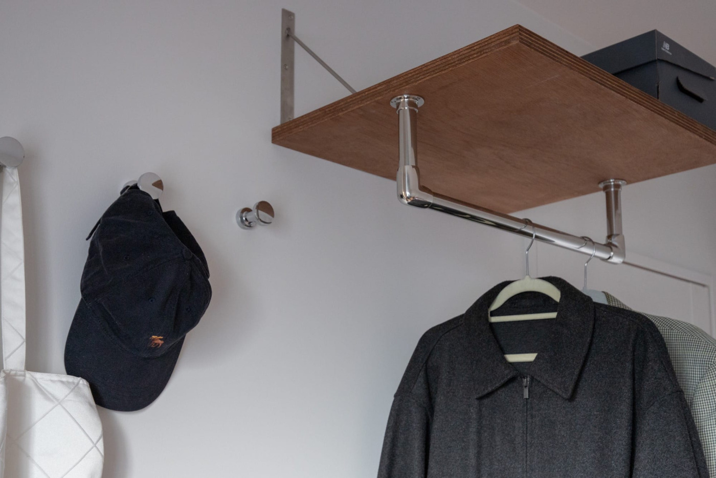 棚受け金物を逆さに使った浮遊感のある棚にハンガーラインを組み合わせて、棚とハンガーラックをつくるアイデア。キラリと光るメタル素材が、魅せるクローゼットにぴったり。