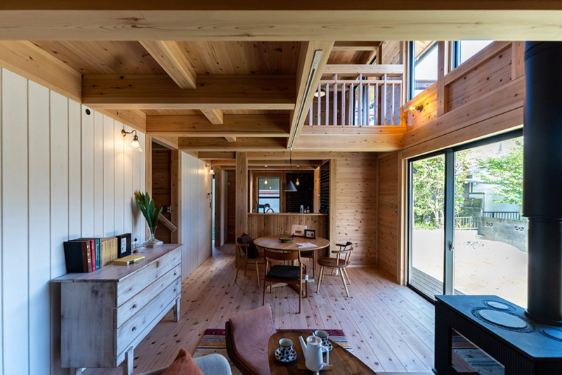 日本古来の伝統工法を住宅に応用した「板倉構法」の住まい。構造材がそのまま内装の壁となり、まるでログハウスのような心地よさが広がります。