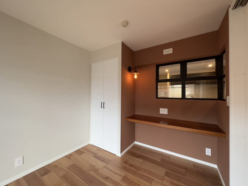 室内窓越しにリビングダイニングとつながる一角は、里帰りしたお子様用のゲストスペース。ワークカウンターの天板には、以前使っていたダイニングテーブルを再利用したもの。