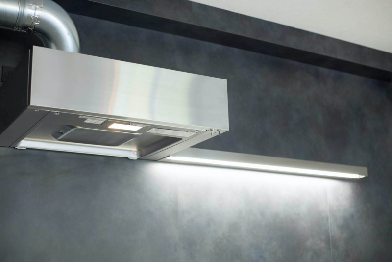 照明やレンジフードもステンレスで統一し、ラインを揃えてシャープな印象に。