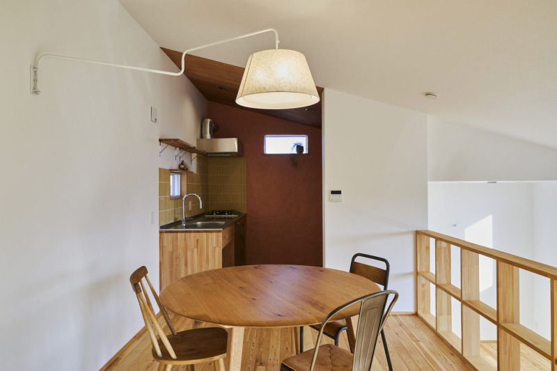 リビングから一段上がったダイニング。壁付け照明がアクセントとなり、和紙越しにこぼれる穏やかな光が空間をやさしく包みます。