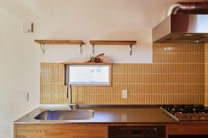 素朴な風合いのタイルが親しみやすさを演出。天板やレンジフード、棚受けをステンレスで統一し、すっきりとした印象に。