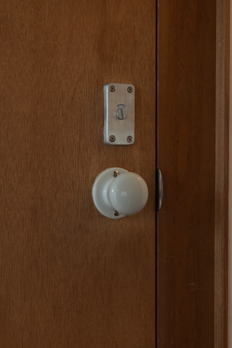クラシックなデザインの陶器製ドアノブが、ラワン仕上げのドアによく似合っています。簡素なデザインの表示錠も好ましい。