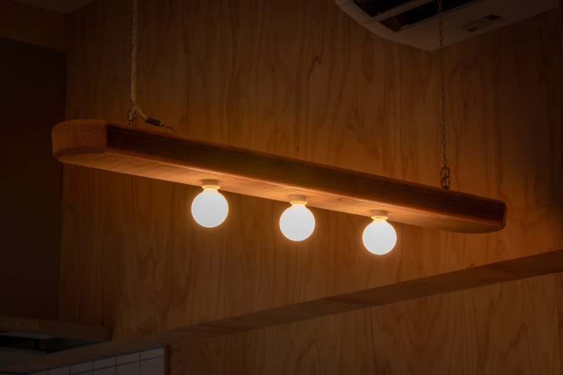 3連灯のペンダントライトは、かつてこの家で筋交として活躍していた材をリメイクしたもの。家が育んできたストーリーを次の空間に引き継ぐナイスアイデア。