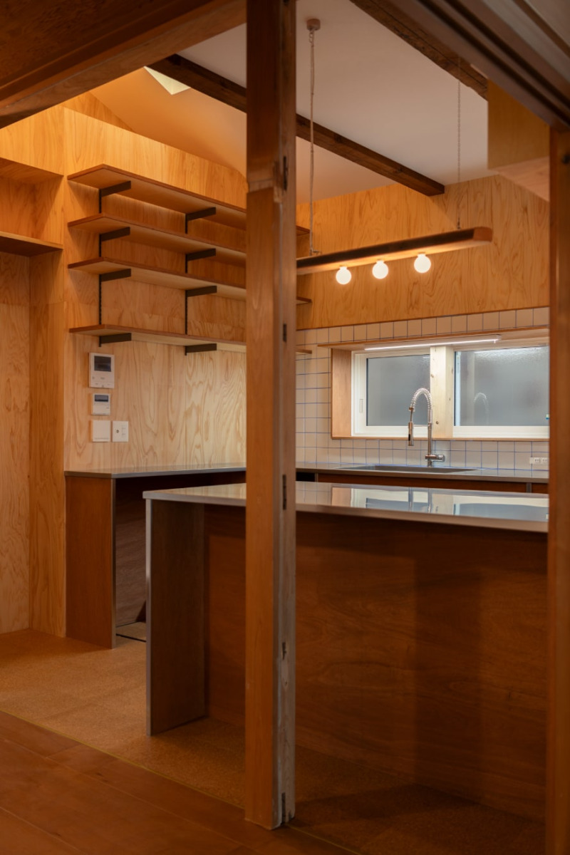 L型の壁付けキッチンと対面カウンターを組み合わせた、作業性も収納力も高いキッチン。壁の上部に取り付けた棚は、薄い板状の棚受けで、幅のあるものも置きやすい。
