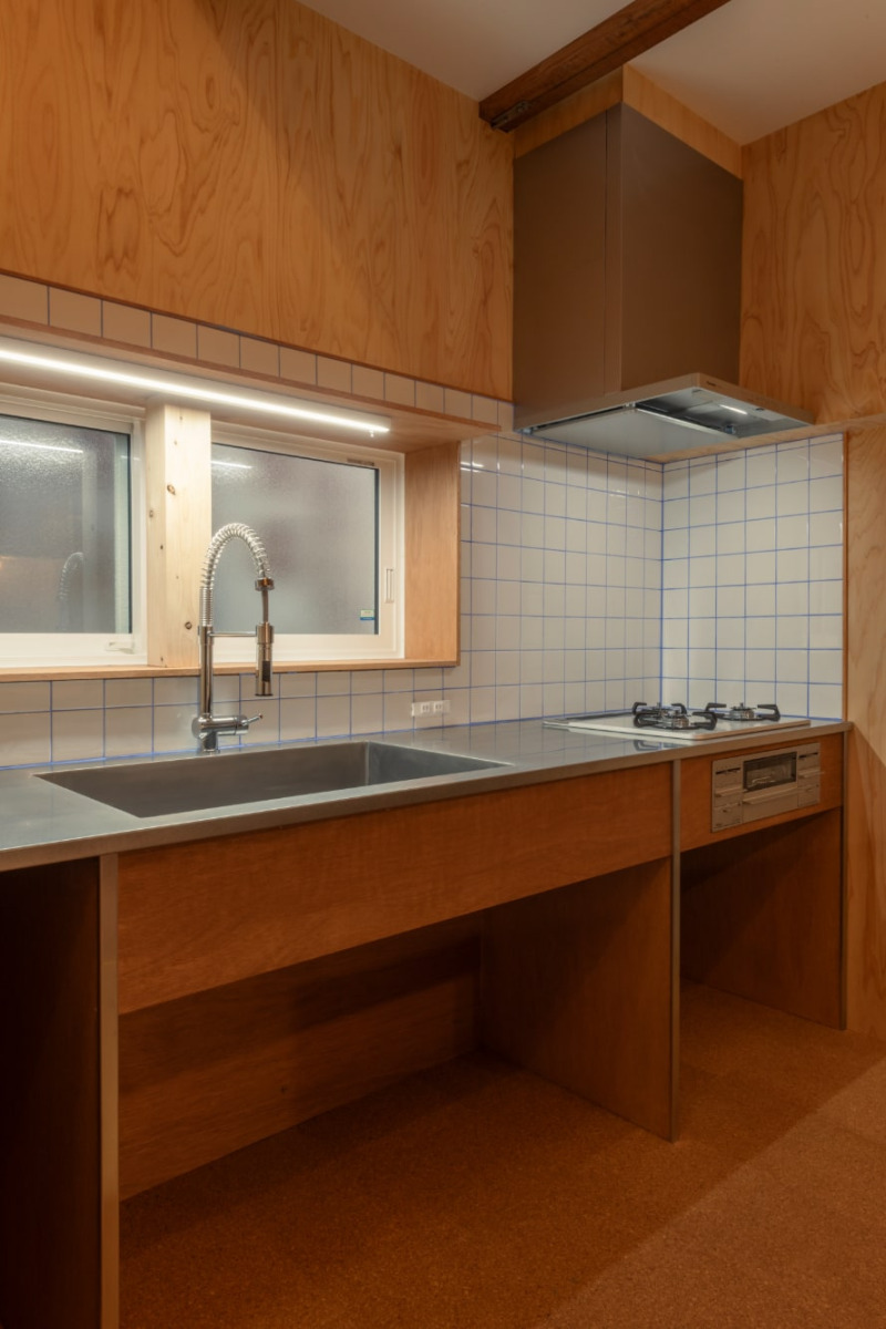 100角の白タイルや窓台が懐かしさを感じさせるキッチン。水色の目地が定番タイルに新鮮な印象を添えています。
