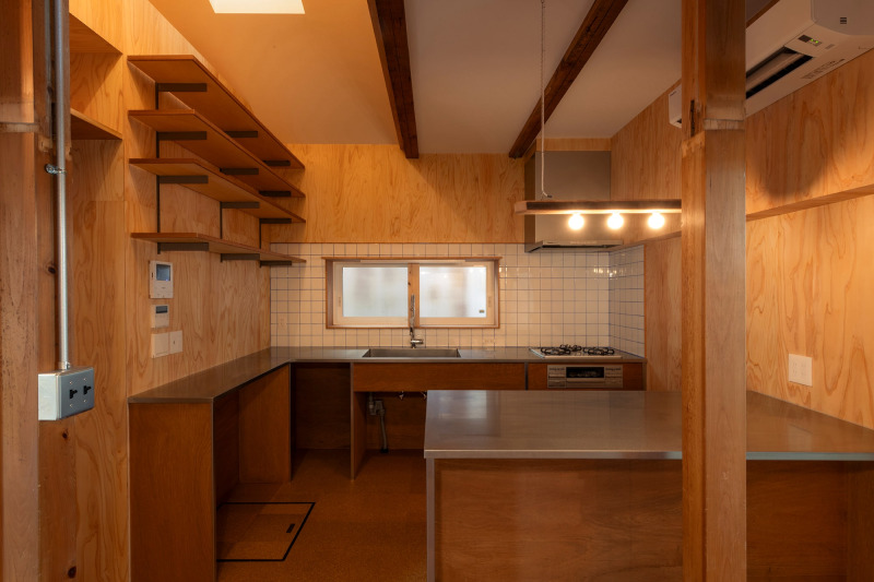 料理の腕をふるいたくなる、L型とカウンターを組み合わせた広々キッチン。勾配天井のトップライトから差し込む光が、ステージのようにキッチンを照らします。