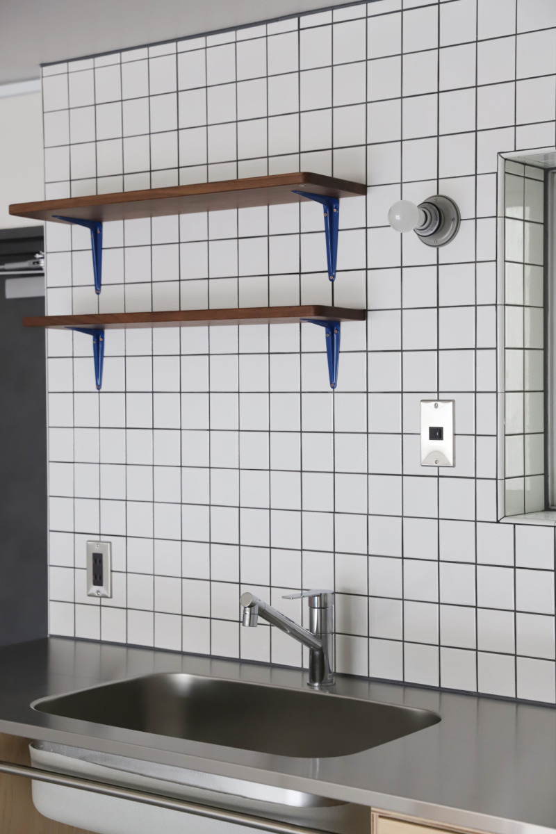 カラー塗装したブラケットと『フリーカット無垢材 ウォルナット』の組み合わせ。下段は目線の高さになるので奥行きを狭めて、キッチンに立ったときの圧迫感を軽減しています。