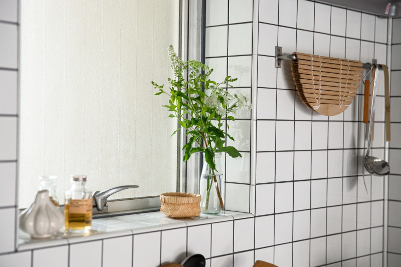 壁をふかす際に既存の窓開口部分はそのまま活かすことで飾れるスペースをつくっています。『T番タイル 細竹割』は端を斜め45度にカットして継ぐ「留め加工」を施しました。