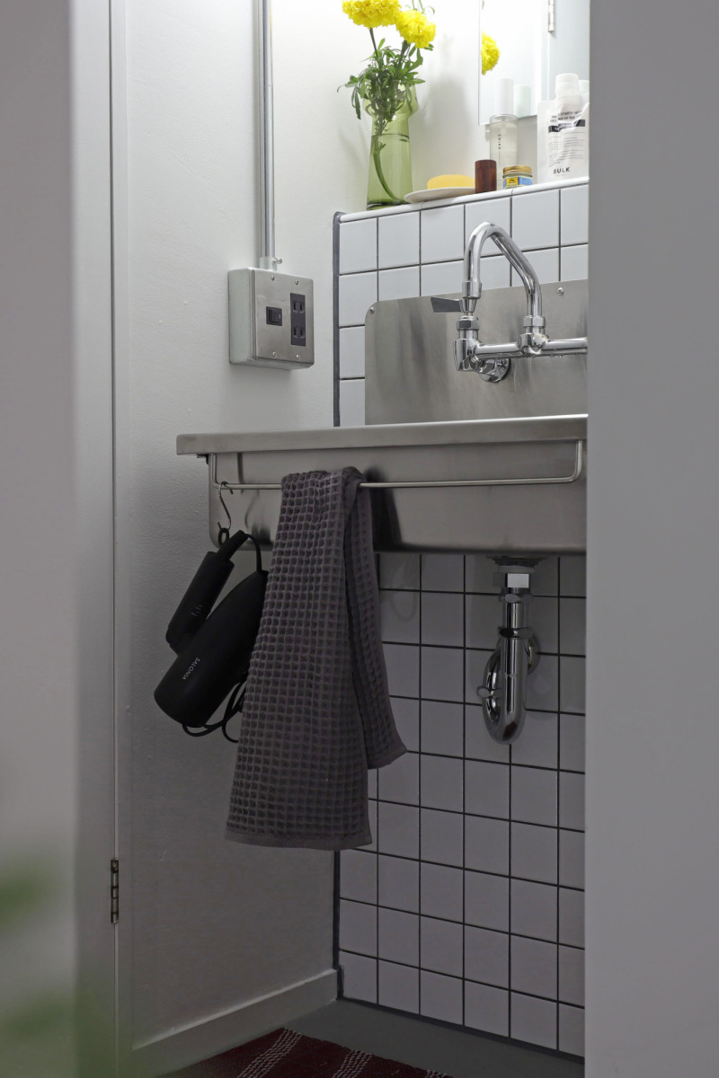 『スクールシンク』にはバーがついていて、ドライヤーやタオルを引っ掛けられます。限られたスペースで収納が取りづらかったため、配管のためにつくった背面のライニングを活かし、小物を置ける場所として使えるようにしています。
