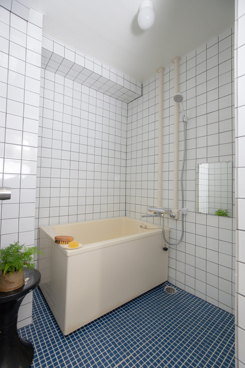 壁には『T番タイル ホワイト 100角』を増し貼りし、照明には『ミルクガラス照明』を使用。青い床タイルは既存のままでレトロな雰囲気を残しながらも、清潔感のある仕上がりに。