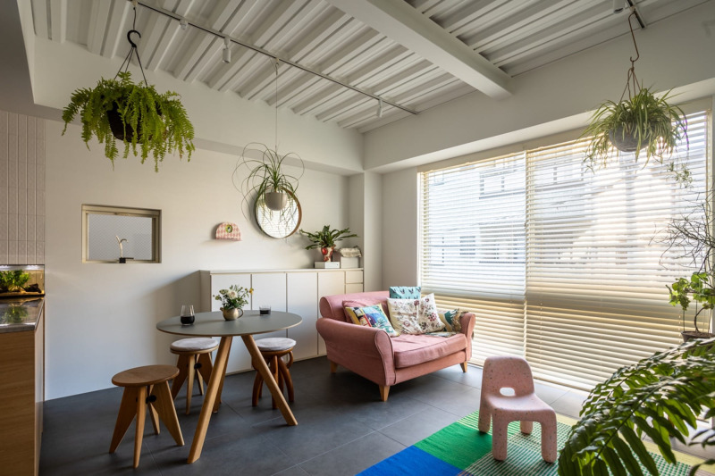 デッキスラブ現しで天井高のあるリビング。壁面と同じ白塗装で仕上げ、窓からの光を柔らかく拡散しています。