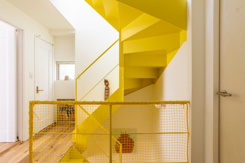 鮮やかなレモンイエローの階段!既存階段の壁を取り払うことで、階下まで光を届ける吹き抜けのような場所へ変わりました。