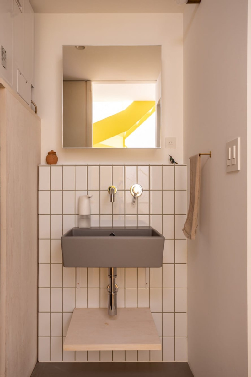 ベトングレーの洗面ボウルや、クロームの壁出し水栓が洗練された印象の洗面空間。目地にグリーンがかったグレーを使ってポイントに。