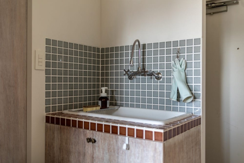 作業用シンクは、バケツも洗える高さに水栓を設置。DIYで貼ったというタイルは、2色使いがユニークです。