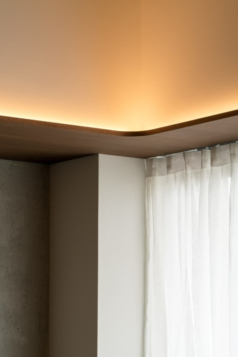 間接照明を仕込んだ棚は、コーナーの入隅を緩やかなラウンド形状に。やわらかな明かりを引き立てています。