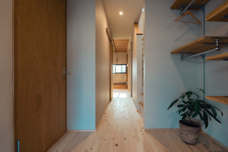 玄関からリビングまでは仕切りをつくらず、ひと続きの抜け感が心地よいつくりに。その動線上には独立したオープンの洗面を配置しました。