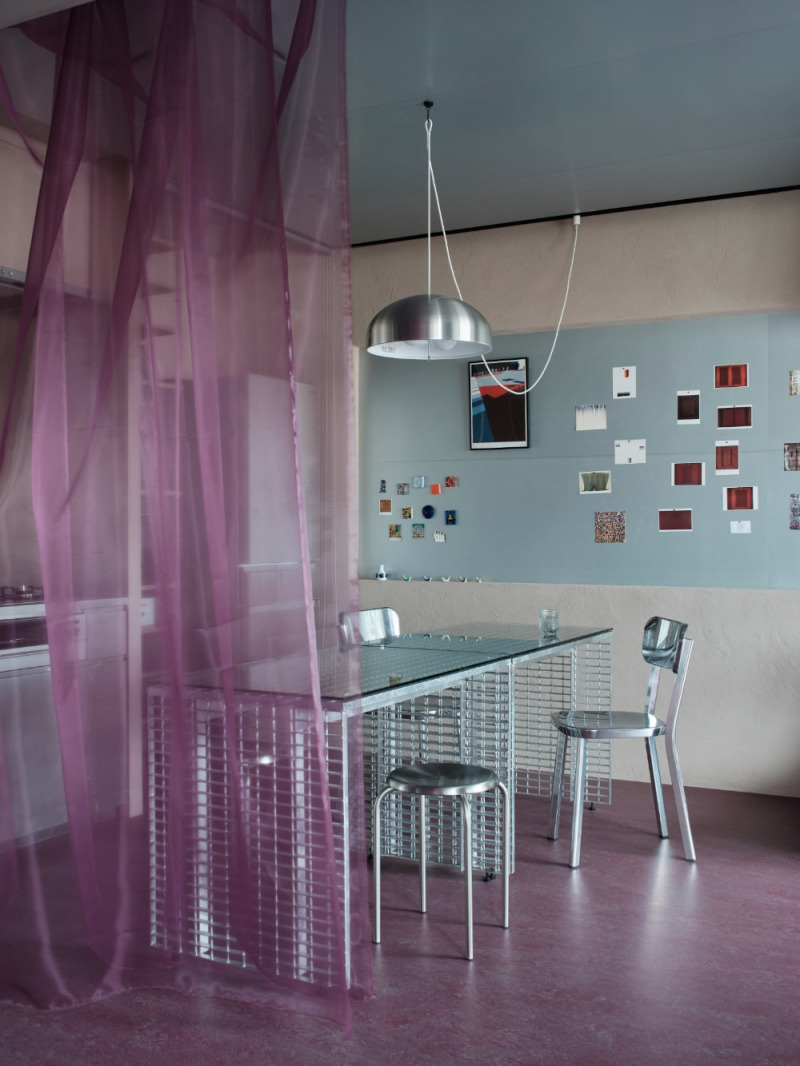 ダイニングテーブルは、グレーチングとガラス天板で作ったオリジナル。壁と天井には溶融亜鉛メッキ鋼板が貼られており、やわらかな雰囲気の左官壁や布とのコントラストが、空間にメリハリを生んでいます。