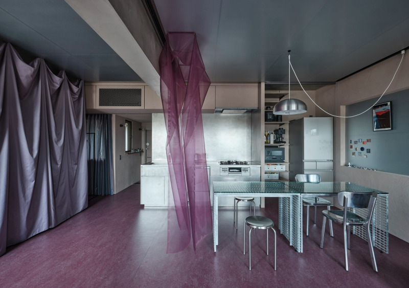 バイブレーション仕上げのステンレスで構成されたキッチンが、鈍く光を反射して、室内に明るさを届けます。
