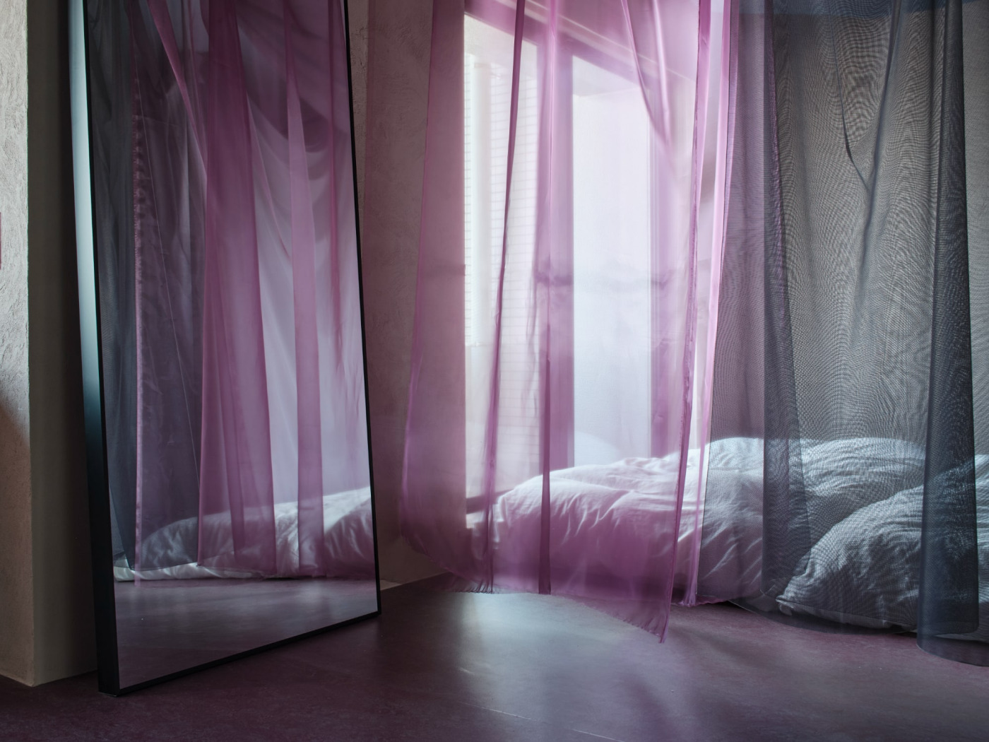 ワンルームスタイルの空間の一角を、カーテンで仕切って寝床に。カーテンを重ねたり、透け感の調整で間仕切り具合を調整できます。