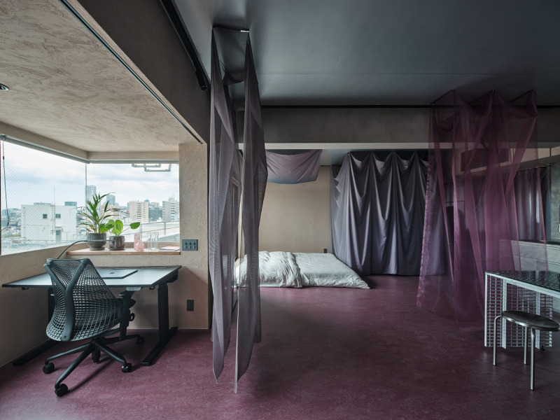 間仕切り壁ではなく、カーテンで空間を区切るワンルーム。その可変性を最大限に活かすため、家具は造り付けにせず、動かしやすい置き家具を使っています。