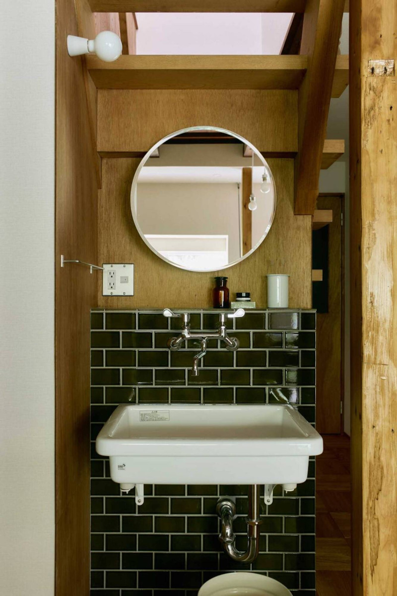 ラワンとレトロな風合いのタイルの素材感が重なって、築年数のある家にしっくり馴染む、落ち着いた雰囲気に。四角いシンクと丸いミラーの組み合わせも◎