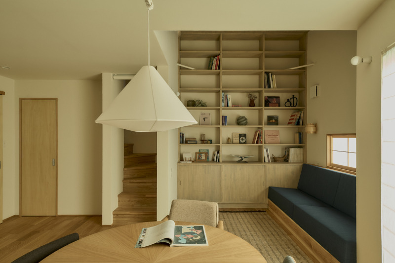 リビングの角に設けられた壁一面の本棚。天井いっぱいまでのスケールを活かした造作で、手前には空間に合わせて仕立てた造作ソファが。