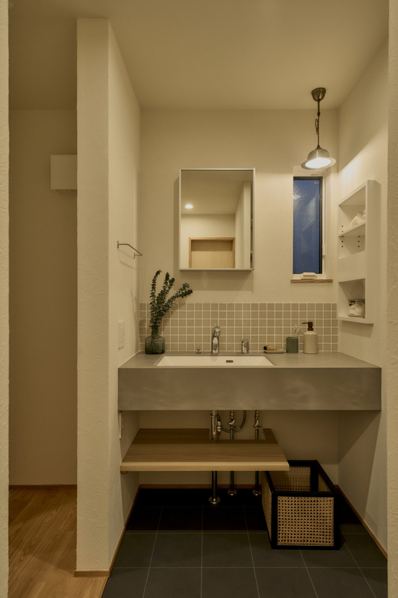モルタルやタイルを組み合わせつつ、色味はやさしく統一した洗面スペース。コンパクトながら、壁に埋め込んだ棚で使い勝手もしっかり確保。ペンダントライトの柔らかな光が、空間をふんわり包み込みます。