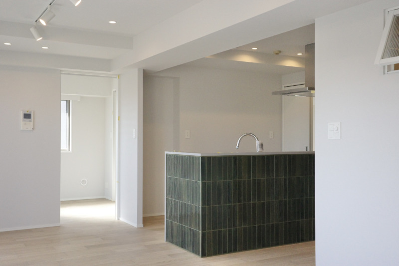 白を基調にした明るく伸びやかな空間に、印象的なタイルキッチンが映える、再販物件の事例です。