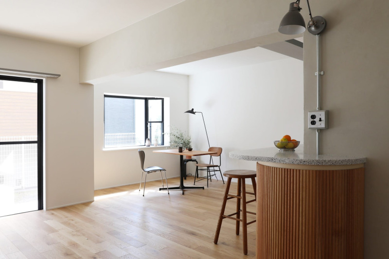 質感ある躯体壁をキッチン天板が飲み込みながらリビング側にぐるりとカウンターになっています。