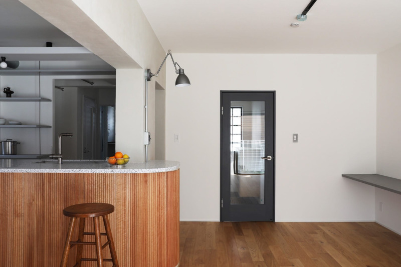 リビング側に延びたキッチンカウンターの上部にはアームライトを取り付け、リビング側の演出にも一役買っています。ダイニング側にはハイスツールを置いて使い勝手も良く。